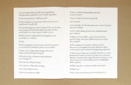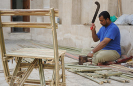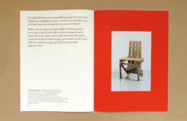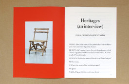 Héritages (an Interview) is a call transcript between the artist Saâdane Afif and a craftsman from an Arish furniture company in Sharjah (United Arab Emirates). Afif commissioned an Enzo Mari chair from the book Autoprogettazione by replacing wood with palm leaves.